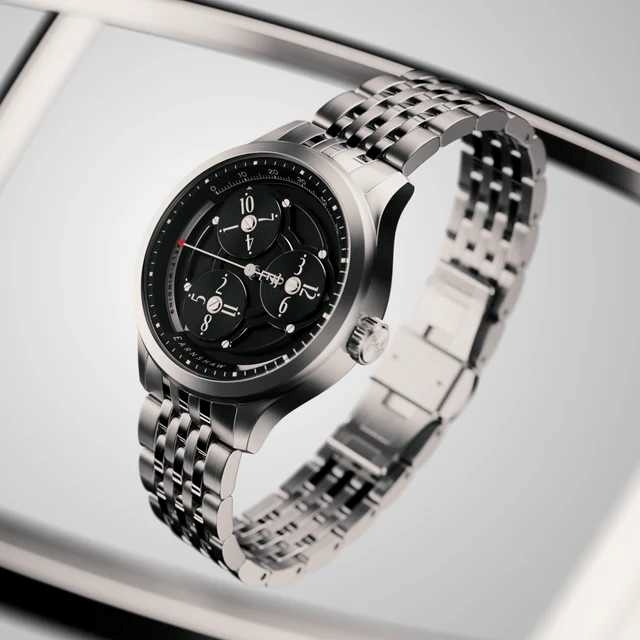 A tribute to Hexham—a historical town renowned for its medieval abbey and as a gateway to Hadrian’s Wall, this 43mm timepiece is a bold statement that bridges history and pioneering craftsmanship.At its heart lies a custom-engineered 'wandering hours' complication, where three rotating hour discs glide across a central carousel, reimagining time in a striking, three-dimensional display. Silver-tone stainless steel case and bracelet. Fixed silver-tone stainless steel bezel. Black dial with silver-tone hands and index hour markers. Minute markers around the outer rim. Dial Type: Analog. Automatic movement. Scratch resistant sapphire crystal. Pull / push crown. Transparent case back. Round case shape, case size: 43 mm, case thickness: 15 mm. Band width: 22 mm, band length: 8 inches. Fold over clasp with a safety release. Water resistant at 50 meters / 165 feet. Functions: hour, minute, second. Hexham Trisect Series. Casual watch style. Thomas Earnshaw Hexham Trisect Black Dial Men's Watch ES-8304-11.